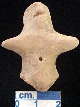 | Description / विवरण | A terracotta archaic human figurine, red, pin hole eyes, pinched nose, slit mouth, short out stretched arms, pin hole navel, both short legs are broken, treated with red wash, handmade. |