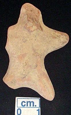 | Description / विवरण | An archaic terracotta human figurine, red, pinched nose, pin hole eyes, slit mouth, short out stretched arms but right one is broken with one incised line in each, punched navel, shrot wide bridged stumpy legs with one incised line in each but some damaged, treated with red wash, handmade. |