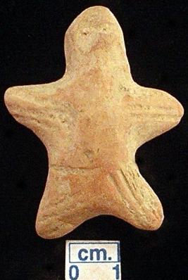 | Description / विवरण | An archaic terracotta human figurine with round head, red, pinched nose, pin hole eyes, slit mouth, short out stretched arms with two incised line in each, shrot wide bridged stumpy legs with two incised line in each, treated with red wash, handmade. |