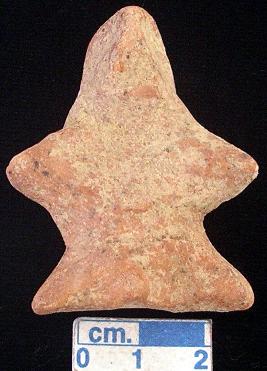 | Description / विवरण | A star shape terracotta archaic male figurine with elongeted head, red, pinched nose, slit mouth, short out stretched arms, short wide bridged stumpy legs, phallus indicated, treated with red wash, handmade. |