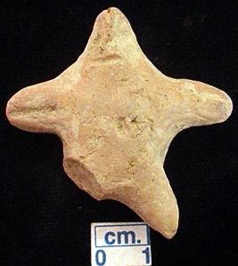 | Description / विवरण | An archaic terracotta human figurine with round head, red, pinched nose, pin hole eyes, slit mouth, short out stretched arms, shrot wide bridged stumpy legs but right one is broken, punched navel, treated with red wash, handmade. |