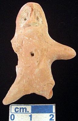 | Description / विवरण | A terracotta archaic human figurine with round head, red, pin hole eyes, pinched nose, open slit mouth, short out stretched arms but the right one is broken, pin hole navel, short bridged stumpy legs but the left one is broken, traces of red slip, handmade. |