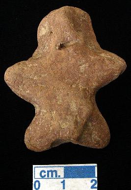 | Description / विवरण | A terracotta archaic human figurine with round head, punched eyes, pinched nose and slit open mouth, short out stretched stumpy arms, short wide bridged stumpy legs and treated with red wash. |