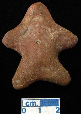 | Description / विवरण | A star shaped terracotta archaic human figurine with round head, punched eyes, pinched nose and slit open mouth, short out stretched stumpy arms, punched navel, short wide bridged stumpy legs and treated with red wash. |