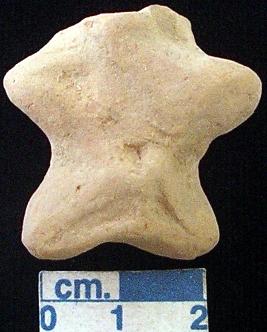 | Description / विवरण | A terracotta archaic human figurine with broken head, red, short out stretched arms, pin hole navel, short wide bridged stumpy legs, treated with red wash, handmade. |