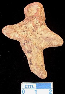 | Description / विवरण | An archaic human terracotta figurine, red, pinched nose, split mouth, short out streched arms, legs are broken, punched eyes, punched navel, |