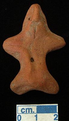 | Description / विवरण | A terracotta archaic human figurine with elongated head, punched eyes, pinched nose and slit open mouth, short out stretched stumpy arms, punched navel, short wide bridged stumpy legs and treated with red wash. |