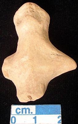 | Description / विवरण | A terracotta archaic human figurine, red, pin hole eyes, pinched nose, slit mouth, short out stretched arms but some damaged, punched navel, broken legs, treated with red wash, handmade. |