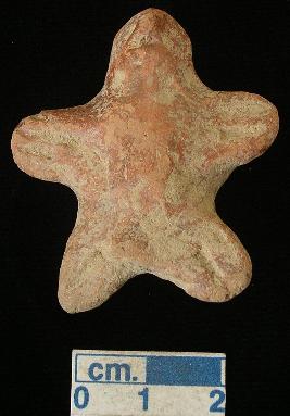 | Description / विवरण | A tiny archaic human terracotta figurine with round head, red,pin hole eyes, pinched nose, open mouth, short out wide stretched arms with two incised lines in each, short wide bridged stumpy legs with two incised lines in left leg and one incised line in right leg, traces of red slip, handmade. |