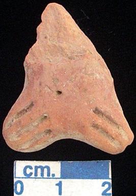 | Description / विवरण | A terracotta archaic human figurine, red, upper portion is broken, pin hole navel, short wide bridged stumpy legs with three incised lines in right one and two incised lines in left one, treated with red wash, handmade. |