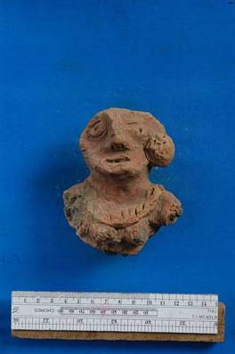 | Description / विवरण | Terracotta female bust having incised eyes and mouth. It has prominent nose. Only left ear with earring survives. She wears a necklace. Hand and breasts damaged. |