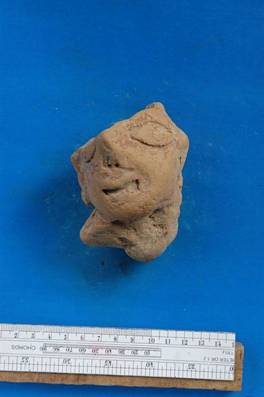| Description / विवरण | Terracotta head. Eyes incised and diamond shaped. Part above nose gone. Only left eye remaining here. |
