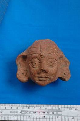| Description / विवरण | Terracotta head having large ears. There is an urna mark on the forehead. Circular ear tops plugged in the ears. Left ear and back part of the head damaged. |