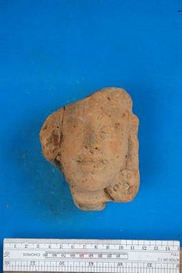 | Description / विवरण | Terracotta head wearing round earrings. Right ear and part above forehead lost. Right ear and right part of the head is broken and joint again. |