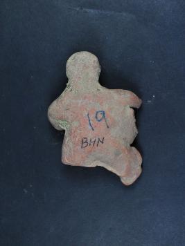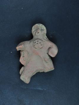| Description / विवरण | It is a human figurine made of terracotta.It is well fired and color is red.Its face details are not clear visible.Its hair are decorated.Its all legs and hands are lost.It has some pinned design on its chest. |