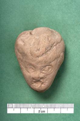 | Description / विवरण | Terracotta head of a male figure having oblong face. Headdress arranged in the form of a flat juda. Crude eyes. Grey clay. |