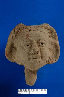 | Description / विवरण | Terracotta head of a figure with a ten on at the neck. Headdress partly broken. It has bold and shape features. |