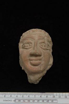 | Description / विवरण | Terracotta head having a prominent nose and smiling face. There is a raised border above the forehead. Ears lost. Left eye injured. |