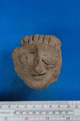 | Description / विवरण | Terracotta head. Hair arranged. Mouth open and nose injured. |