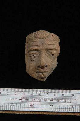 | Description / विवरण | Terracotta head with prominent nose and perforated eye balls. Left side cheek damaged. It has bold features. |