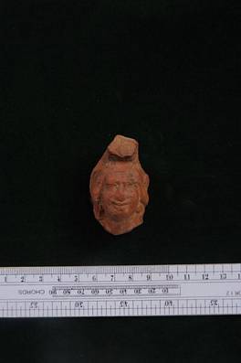 | Description / विवरण | Terracotta head wearing a headdress coiled above forehead. Headdress and forehead injured. |