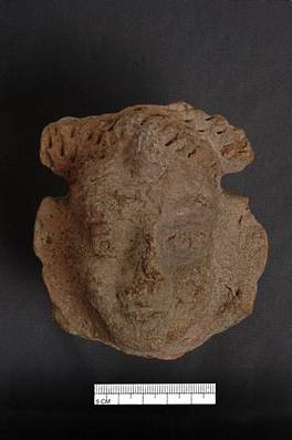 | Description / विवरण | Terracotta head having a smiling face. Hair shown arranged upwards and indicated by incised marks. A pendent is seen suspended on the forehead. Eyes incised. Nose damaged. |