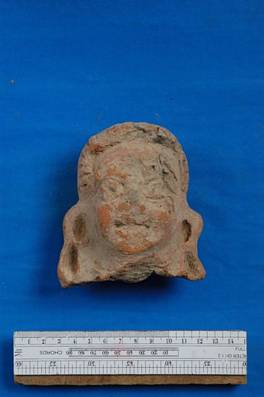 | Description / विवरण | Terracotta head. Mouth, nose, forehead and chin damaged. It has deep depressions on ears. |