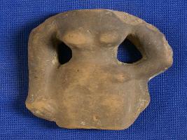 | Description / विवरण | Standing female moulded figurine from neck to knee, her left hand hold akimbo. She wears dhoti secured by left hand resting on waist. Not well baked. |