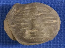 | Description / विवरण | Head of female figurine. Eyes and mouth are indicated by incised design. Colour of this figure is blackish grey. A hole is on the back side of the head, it is handmade. |