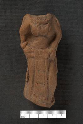 | Description / विवरण | Terracotta torso of a female. She wears two necklaces on her neck with a prominent pendent. It wears a decorated sari with a wide strap on the front. Hands rest on the waist. |