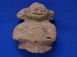 | Description / विवरण | Standing male figurine, a conical top type cap on head. Its nose and right ear is made by pinching method. Eyes are shown by two holes, mouth by cut marks. Left ear is missing. Neck is decorated by two horizontal lines like garland. Right hand is fold and placed on chest. A hole for navel. |