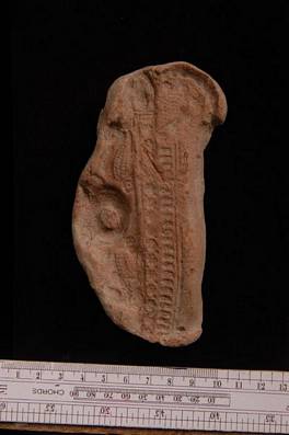 | Description / विवरण | Terracotta mould of the part of a toy cart having a depression at the top of it. There are two lines of rosettes and dots. |