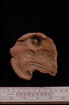 | Description / विवरण | Terracotta mould preserving a depression on the lower part and two lotus flowers above it. It represents a side part of a toy chariot. |