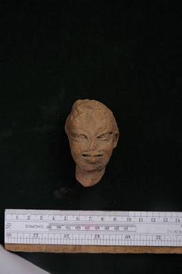 | Description / विवरण | Terracotta female head. Right ear lost, forehead and nose injured. Hair damaged. |