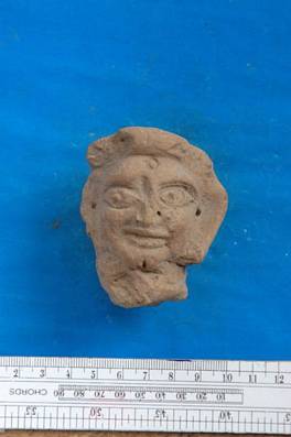 | Description / विवरण | Terracotta head with an incised urna mark on it forehead. Nose and right ear damaged. |