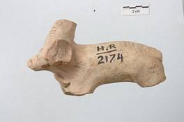 | Description / विवरण | Animal figurine with prominent physical features. Two horns have deep incised line design, though broken in middle. Face is prominent and pointed which appears as a stout. Rest of the body is well defined. There is trace of legs but it is broken from below the body. |