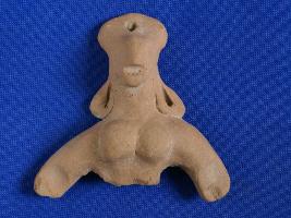 | Description / विवरण | Bust of a female figure, showing a goat s face. The crescent shaped projection on the head shown a suspension hole , well molded breasts, hand incised by spoon like depressions. |