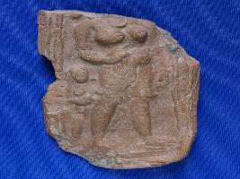 | Description / विवरण | Fragmentary plaque, showing a female figure standing on a pedestal. She wore a pearl-necklace, bangles and a Sutra hanging from her left breast over the body and reaching between the legs. Another female figure is standing on the right side. Moulded to red colour. |