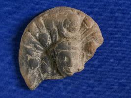 | Description / विवरण | Fragmentary plaque showing a male head, probably Buddha, back side a hole like circular foliage traced. Well moulded, smiling face shown, half closed eyes, long ears Pralamb Karna . Usnisa like mark on head. But it ll be better to imagine lion like figure on head. |