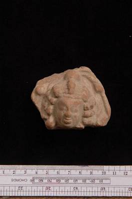 | Description / विवरण | Head of a lady with hair parted in the middle by an ornamental falling on either side in several locks. Eyes weatherworn. |