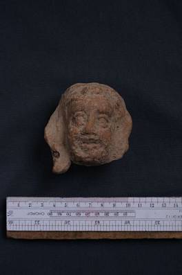 | Description / विवरण | Terracotta head having a prominent nose. Hair arranged above and tied with a band. Ears lost. Left cheek injured. |
