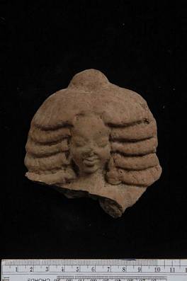 | Description / विवरण | Terracotta head with hair arranged in coiffures on either side making five layers and parted in the middle with a bump at the top. Nose injured. Eyes weatherworn. |