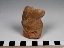 | Description / विवरण | A fragment of a terracotta male deity showing pralambhpaad posture with left hand in abhay mudra and right hand resting on the knees, having a big helly, broken head and seating on a platform. |