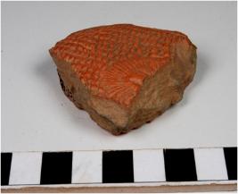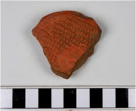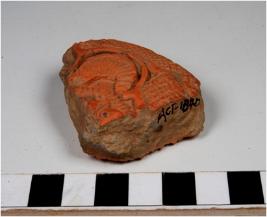 | Description / विवरण | A fragment of a terracotta hollow round plaque showing floral design on both sides of smooth surface. |