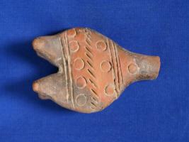| Description / विवरण | Flat moulded figurine showing a serpent of headless body, marked with ring-punches and nail-cut design. Breast is shown by ring as round circular plaque and of three ring-punches. Long waist and abdomen are marked by a pattern nail-cut design. A series of five ring-punches and several rims. Leg is showing. |