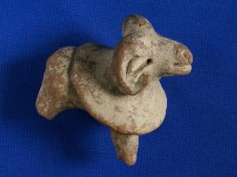 | Description / विवरण | Ram figurine nostril shown by incised holes and mouth by cut-slit. Ears indicated by incised dash ears are covered by horns. Neck is decorated by circular shape design as wearing cloth. Tail missing hind legs is broken white traces with red colour. Neck is decorated by circular shape design as wearing cloth. |