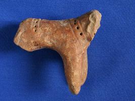 | Description / विवरण | Fragment of Cow figurine. Face and back hind legs are broken. Bands of incised hole between two lines are shown on upper portion of neck and back. Handmade, red slipped. |
