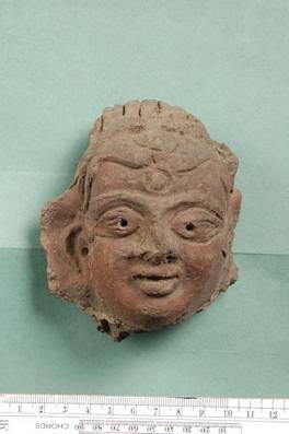 | Description / विवरण | Terracotta head with an urna mark punched on the forehead. Hair dressed backside. Eye pupils represented by a groove in the eye balls. Left ear almost lost. Eyes prominent. |