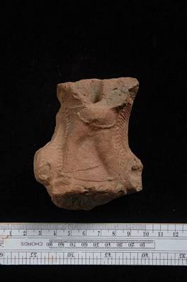 | Description / विवरण | Fragment of a toy cart preserving the lower portion of a lady wearing a fine sari supported by one stringed girdle. |
