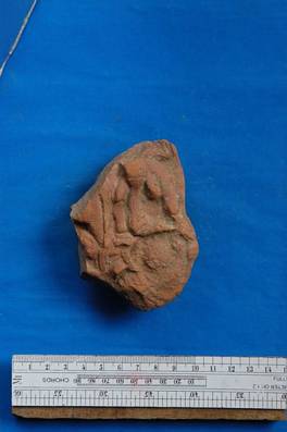 | Description / विवरण | Fragment of a plaque showing legs of a figure and other un-indentified objects. |
